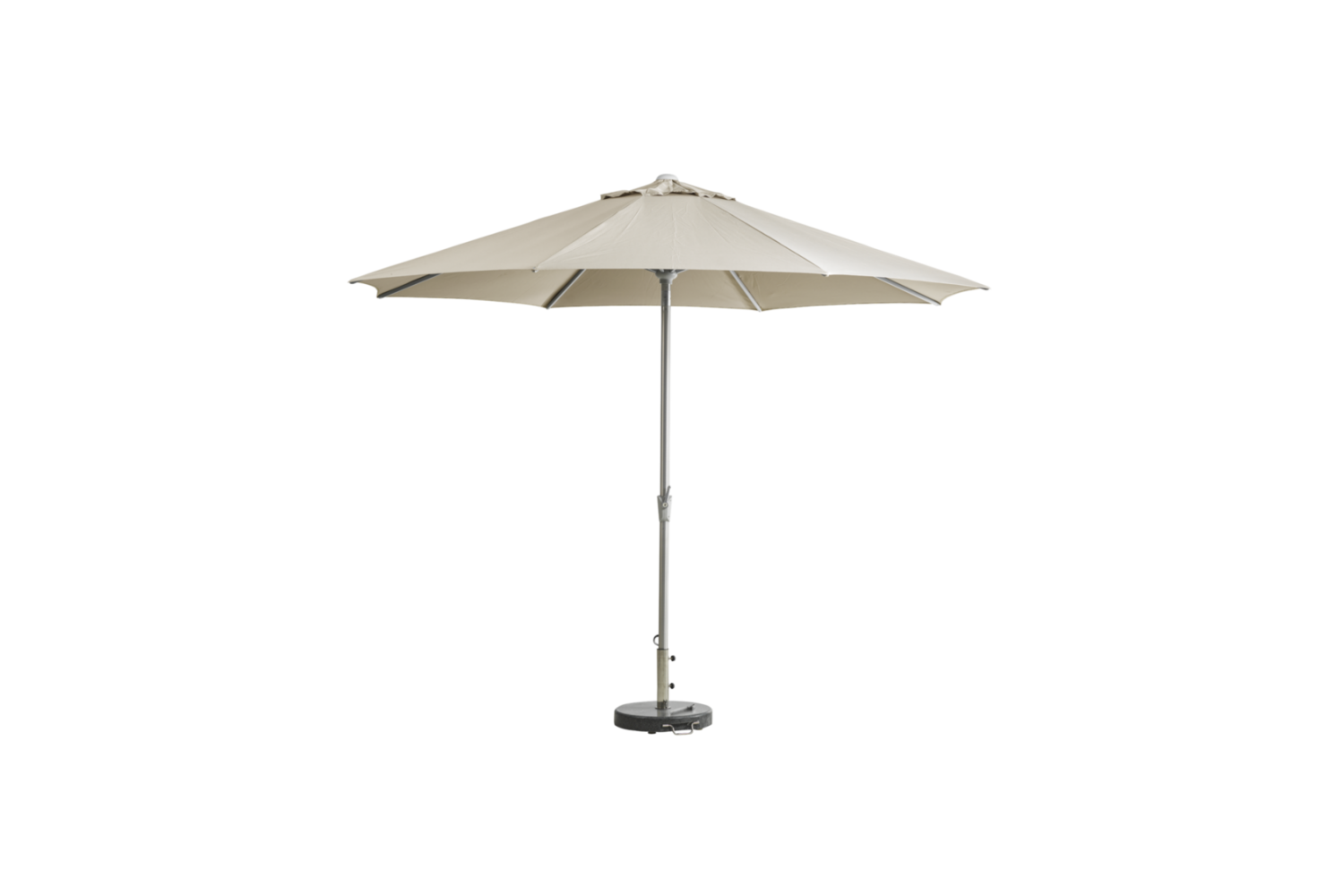Parasollen har silverfärgad aluminiumstång i två delar med en diameter på 48 mm. Stången är utrustad med en vev och en automatisk tiltfunktion, vilket gör det enkelt att vinkla parasollen.