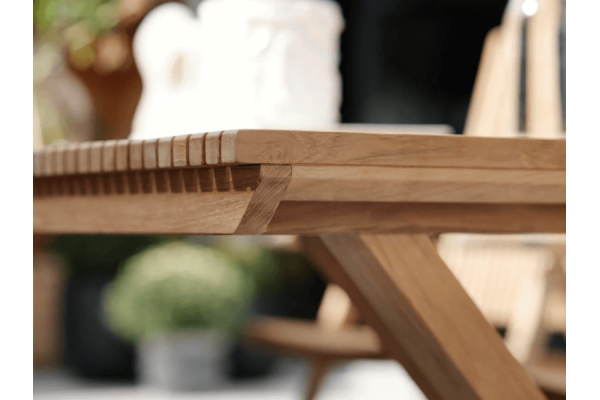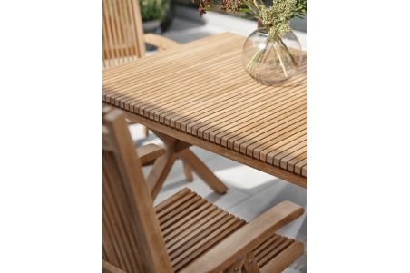Ett bord att njuta av och vid. Här får de tvärgående teakribborna verkligen ta plats och dra blickarna till sig. Snygga och rejäla kryssben gör bordet lika vackert även från sidorna. Finns i två storlekar.