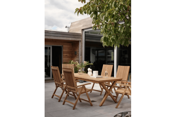 En vacker premiumgrupp med tvärgående teakribbor som genomgående inslag – Julita tar de raka linjerna från den skandinaviska designen med sig och skapar en skön matplats som sticker ut med sin stil samtidigt som den smälter in i omgivningarna.