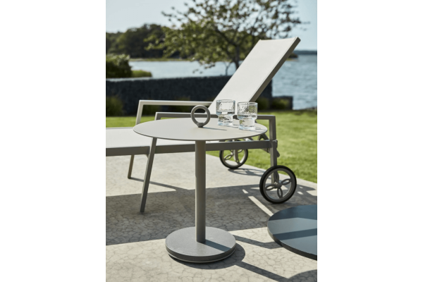 En perfekt avställningsyta bredvid vilstolen, solsängen, loungegruppen eller i trädgården – Niobe tar du enkelt med dig tack vare den dekorativa och stadiga ringen i bordsskivan. Foten i kompositsten gör att bordet står stadigt var du än placerar det.