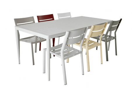 Bigby matbord i ljusgrått med sex Delia-stapelstolar i olika färger är en modern och stilren grupp-kombination. Att sätta stolar av olika färger runt bordet är en trend som vi ser mer och mer utav och det ger ett härligt liv till gruppen. Bigby-bordet är ett stilrent, lättskött och vackert bord helt i aluminium. Benen har en justerfot längst ner ifall underlaget är ojämt. Delia stolen är också helt i aluminium, stapelbar och väldigt skön att sitta i. Stolarna kommer färdigmonterade och bordet i platt paket och kräver lättare montering av benen.