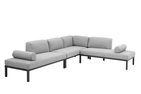 Soffgruppen är tillverkad av matt pulverlackad antracitgrå aluminium med dynor i ljusgrå olefintyg. En utmärkt soffgrupp utomhus.