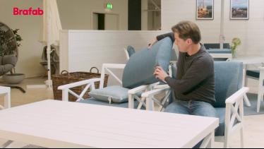 Sottenville serie - klassisk design inspirerad av ett tidlöst formspråk och en tydlig skärgårdskänsla. En vit aluminiumgrupp med vackert formade detaljer som kryss i ryggen, avsmalnande ben och dynor i olefintyg. Dynorna är formade med extra stöd i ryggen. Borden har präglade aluminiumlameller på toppen.