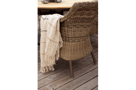 En skön karmstol i rustik stil som passar utmärkt till våra matbord i teak. Levereras med dyna i beige.