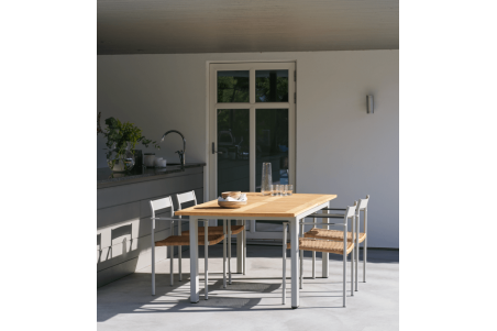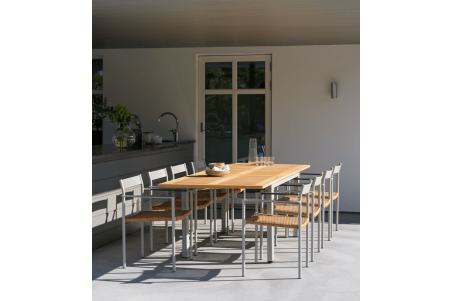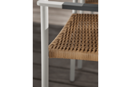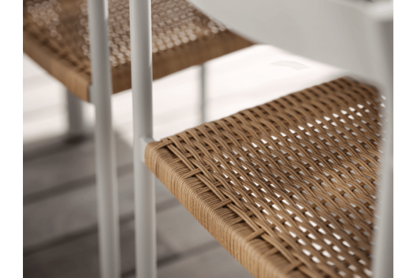 En modern och praktiskt stapelbar stol med stomme i aluminium och sitsen i konstrotting.